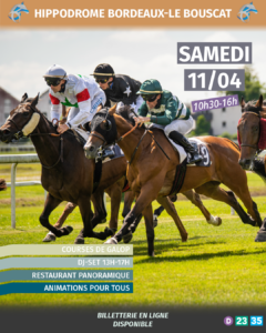 🏇🎉 Samedi 11 avril à l’Hippodrome de Bordeaux–Le Bouscat 🎉🏇 Venez profiter d’une journée de courses de galop dans une ambiance festive et conviviale !